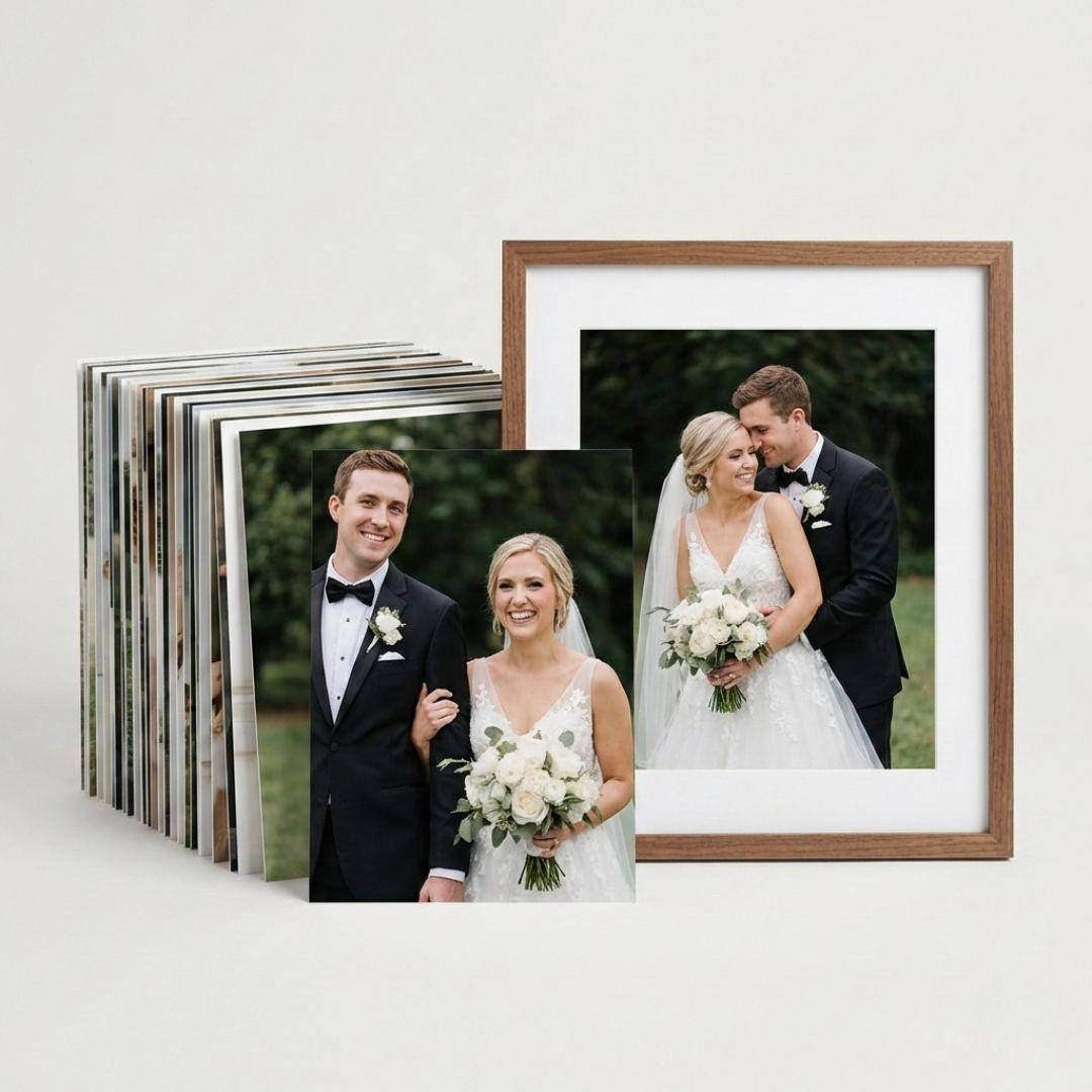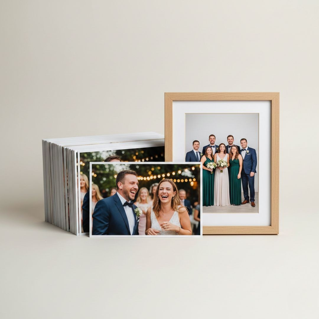 50 fotos impresas tamaño 5x7 con marco acorde al evento, más 1 foto de regalo tamaño 8x10 en marco de madera.